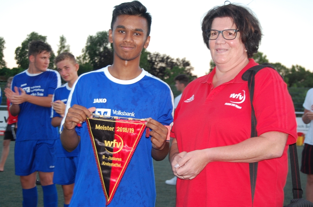 Die Partie auf neutralem Platz in Hohenhaslach begann denkbar ungünstig für die SGM, denn die Lomersheimer bekamen in der Anfangsphase einen berechtigten Foulelfmeter zugesprochen. SGM-Keeper Pascal Miller konnte den gut geschossenen Ball jedoch parieren. Auf der anderen Seite war es dann in der 12. Minute Luis Mohrlang, der den Ball zum 1:0 für Sachsenheim über die Linie drücken konnte. In der zweiten Spielhälfte diktierte die SGM das Spielgeschehen, schaffte es aber trotz Chancen nicht das erlösende 2:0 zu erzielen. Nachdem Pascal Miller zunächst eine Großchance der Lomersheimer mit tollem Reflex abwehren konnte war er kurz darauf bei einem Gewaltschuss zum 1:1 machtlos. In der ersten Hälfte der Verlängerung war der Jubel dann bei unseren Jungs groß, als Yannick Rothfuss in der 89. Minute mit einer Direktabnahme das 2:1 gelang. Nur eine gute Minute später war Robin Benesch mit einem Freistoß von der Mittellinie zum entscheidenden 3:1 erfolgreich. Die erreichte Meisterschaft wurde nach dem Schlusspfiff zunächst gebührend auf dem Spielfeld gefeiert bevor Kapitän Raoul Balakumar aus den Händen von Staffelleiterin Dagmar Gora den Meisterwimpel erhielt.
