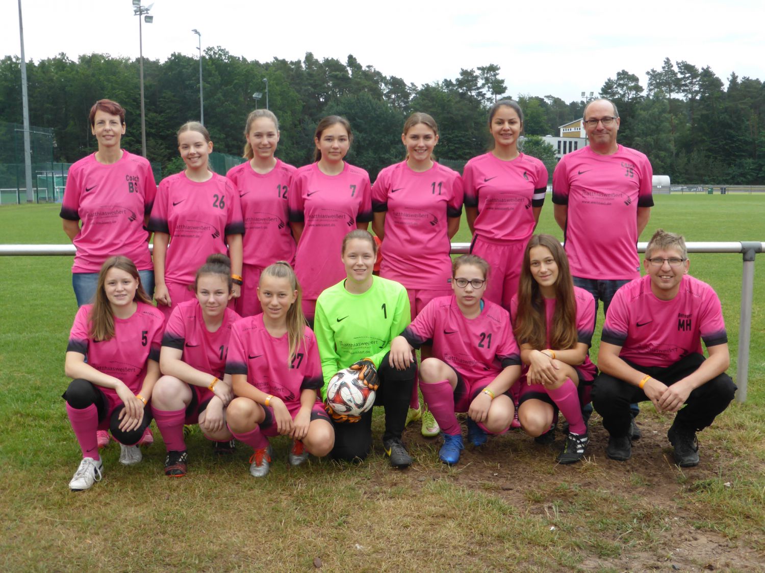 Die B-Juniorinnen der SGM Sachsenheim waren kürzlich bei einem internationalen Turnier für U17-Juniorinnen in Kaiserslautern am Start. Von Freitag bis Sonntag hatten die elf Sachsenheimer Spielerinnen im Alter von 13 bis 17 Jahren und ihre Betreuer viel Spaß. Gespielt wurde auf den Rasenplätzen der TSG Kaiserslautern und übernachtet in einem in der Nähe gelegenen Schulzentrum. Bereits im Vorfeld wurden die teilnehmenden Mannschaften einem europäischen Land zugewiesen und mussten dieses repräsentieren. Mit Norwegen erwischten die Sachsenheimer Mädels ein skandinavisches Land. Auf Initiative von Trainerin Bianka Gottschalk bekam das Team sogar eigens angefertigte schicke Trikots, die von der Zahnarztpraxis Matthias Weißert gesponsert wurden – dafür nochmals herzlichen Dank! Da die meist aus der Schweiz stammenden Gegnerinnen im Schnitt älter waren und man selbst eine eher durchwachsene Saison gespielt hatte rechnete man sich im Vorfeld nicht allzu viel aus. Doch schon beim Eröffnungsspiel gegen die Niederlande zeigte sich dass man durchaus mithalten konnte und erreichte ein leistungsgerechtes 1:1-Unentschieden. Auch das zweite Spiel gegen England (0:0) verlief zufriedenstellend, während man gegen Frankreich eine unnötige 2:3-Niederlage hinnehmen musste. Das beste Spiel machten die Mädels dann gegen den späteren souveränen Turniersieger Italien, das zwar mit 1:3 verloren ging aber dennoch sehr spannend verlief. Nach langer Pause, die man sich mit u.a. mit lustigem „Bubble-Fußball“ vertrat waren unsere Girls beim letzten Gruppenspiel gegen die Schweiz mit den Kräften am Ende und verloren dieses mit 0:2. Nach dem Abendessen ging es dann noch in eine Bowlingbahn und erst spät nachts kam man ein bisschen zur Ruhe. Die nicht optimale Vorbereitung zeigte sich prompt am Sonntag früh im Spiel gegen Portugal das völlig unnötig mit 0:1 verloren ging. Im abschließenden Spiel um Platz 11 ging es dann erneut gegen die Niederlande und dies war für unsere Mädels nochmals eine Frage der Ehre, die sie nach toller Leistung mit einem 4:3-Sieg nach nervenaufreibendem Neun-Meter-Schießen positiv gestalten konnten. Bei der gut inszenierten Siegesfeier erhielt dann jede Spielerin einen Pokal. Müde, aber zufrieden mit dem Erlebten trafen die SGMlerinnen am Sonntag Abend wieder in Sachsenheim ein.