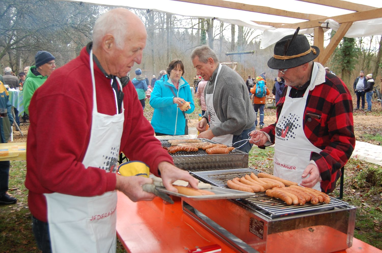 Verein - AllgemeinZum Jahresausklang fanden sich wieder viele TSVler und Gäste auf dem Kleinsachsenheimer Waldspielplatz ein um sich einen guten Rutsch zu wünschen. Die Jedermänner des TSV mussten dieses Jahr krankheitsbedingt auf einige bewährte Kräfte verzichten, so dass der obligatorische Fleischkäsweck dieses Jahr nicht angeboten werden konnte. Doch die „Roten“ und Thüringer vom Grill schmeckten zu Glühwein und Punsch ebenso. Auch der kurzzeitig einsetzende Regen konnte den Gästen die gute Laune nicht verderben. Dicht gedrängt warteten die Besucher in der überdachten Zeltkonstruktion bis der Regen nachließ. Herzlichen Dank an alle Besucher und natürlich unseren tatkräftigen Jedermännern für die einmal mehr gelungene Bewirtung.