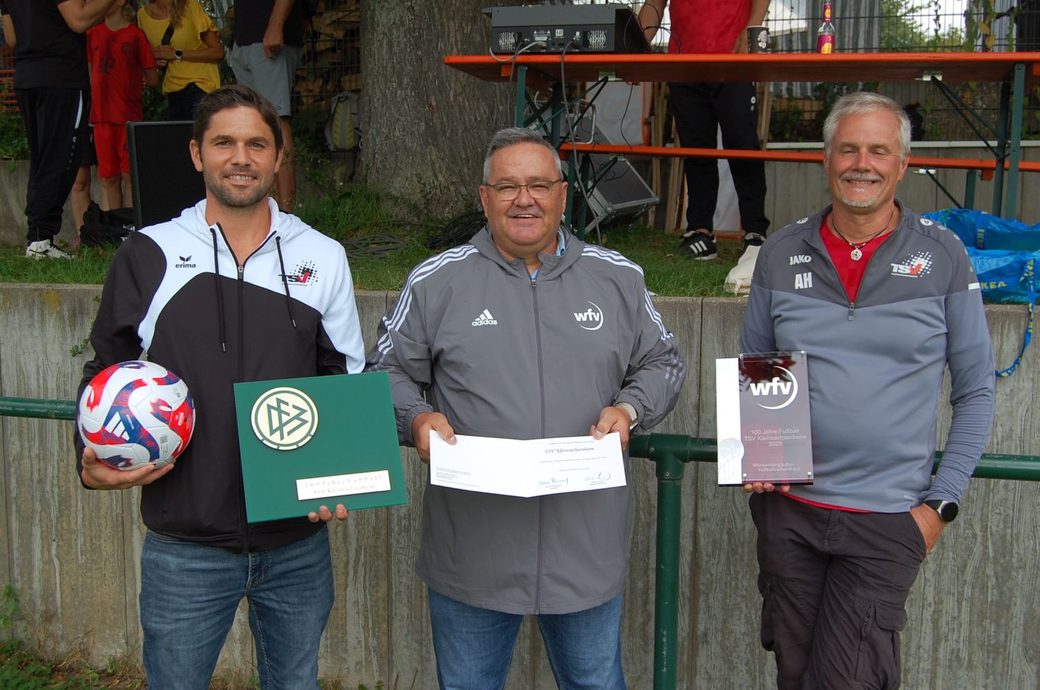Am 6. Januar 1920 fusionierten die Fußballer der damaligen "Teutonia" mit dem ortsansässigen Turnverein zum heutigen Turn- und Sportverein Kleinsachsenheim. Da das 100jährige Jubiläum der Fußballabteilung coronabedingt nicht gefeiert werden konnte wurde dies kürzlich im Zuge des 125jährigen Vereinsjubiläums mit einer kleinen sportlichen Veranstaltung nebst Bewirtung nachgeholt. Ein Leistungsvergleich von vier C-Junioren-Teams, ein Turnier mit acht Teams der E-Junioren und ein Demonstrationsspieltag der F-Junioren sorgte für den sportlichen Teil der Veranstaltung. Der Vorsitzende des Bezirks Enz-Murr, Ingo Ernst, überbrachte in einer Ansprache die Glückwünsche des Württembergischen Fußballverbandes und des DFB und konnte Abteilungsleiter Dennis Böhm und Jugendleiter Andreas Hausser zwei Plaketten, einen Spielball und einen 500-Euro-Gutschein für Sportartikel überreichen.