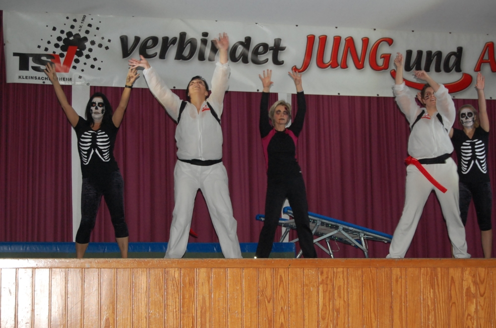 Dann wurde es dunkel im Saal der Kleinsachsenheimer Mehrzweckhalle. Der Moderator kündigte die Ghostbusters an. Die Besetzung der Hauptrollen übernahm das Trainer -Gerätturnteam mit Manuela Schock, Svea Klein, Melanie Schneeweis, Daniela Hartmann und Jeanette Klein. Das Licht ging an und die Geister präsentierten sich in gruseligen Outfits. Die Verfolgung der Geister begann am Trampolin mit Flugrollen, Saltos und lustigen Sprüngen. Dieser Kampf nahm dann am Boden zur passenden Musik mit turnerischen Elementen seinen Lauf.