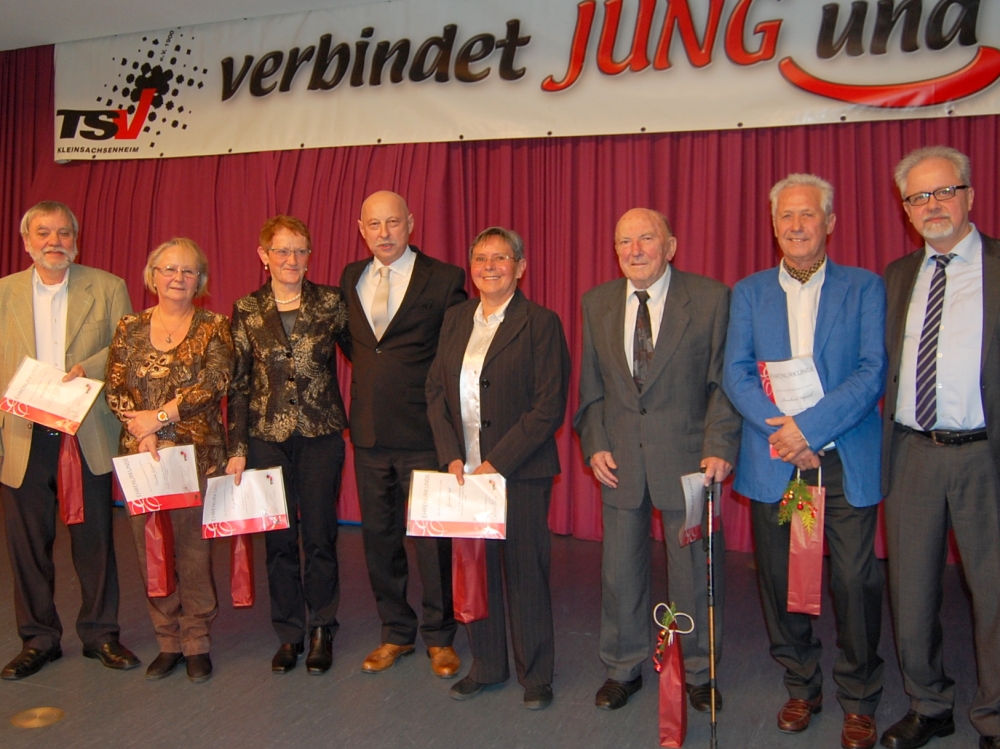 Willi Ellsäßer, Emelda Geippel, Brigitte Härter, Gretel Heß, Heinz Schollenberger, Adolf Schüle, Hans-Peter Wolf und Bernhard Wycisk wurden für 40 Jahre Mitgliedschaft beim TSV Kleinsachsenheim mit der silbernen Ehrennadel beglückwünscht.