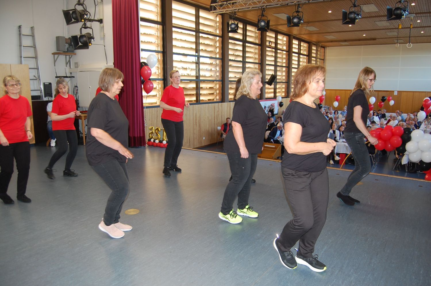 Die erst vor eineinhalb Jahren gegründete Line-Dance-Gruppe konnte unter der Leitung von Gabi Schobloch dann in einem Auftritt den 120 geladenen Gästen zeigen, was man gelernt hat und begeisterte das Publikum auf der Bühne vor den eigens angefertigten Jubiläumsbannern, die das Festjahr auch optisch sichtbar machen werden.