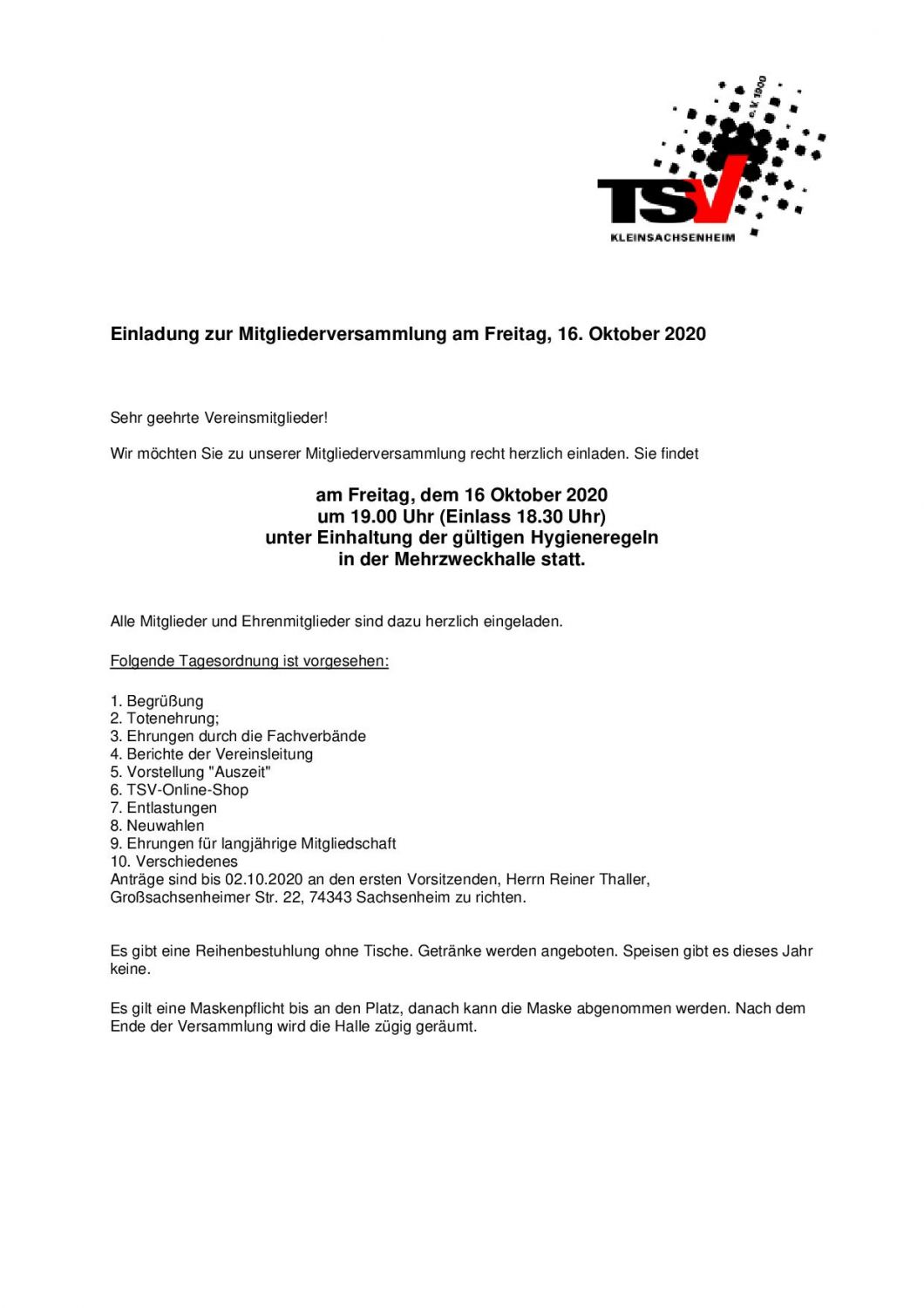 Mitgliederversammlung am Freitag 16.10.2020 um 19:00 Uhr