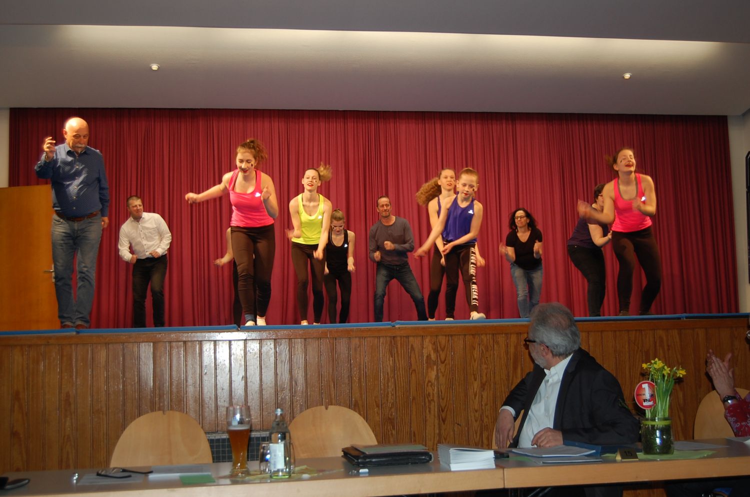 Zu allererst aber begeisterten wieder die Mädchen des Gerätturnens mit ihrer Show-Choreografie die Anwesenden in der Mehrzweckhalle in Kleinsachsenheim, denn sie machten auch das Motto deutlich, der TSV verbindet Jung und Alt, da bei der Zugabe der erste Vorsitzende und weitere Vorstandsmitglieder es sich nicht nehmen ließen, mit zu machen.