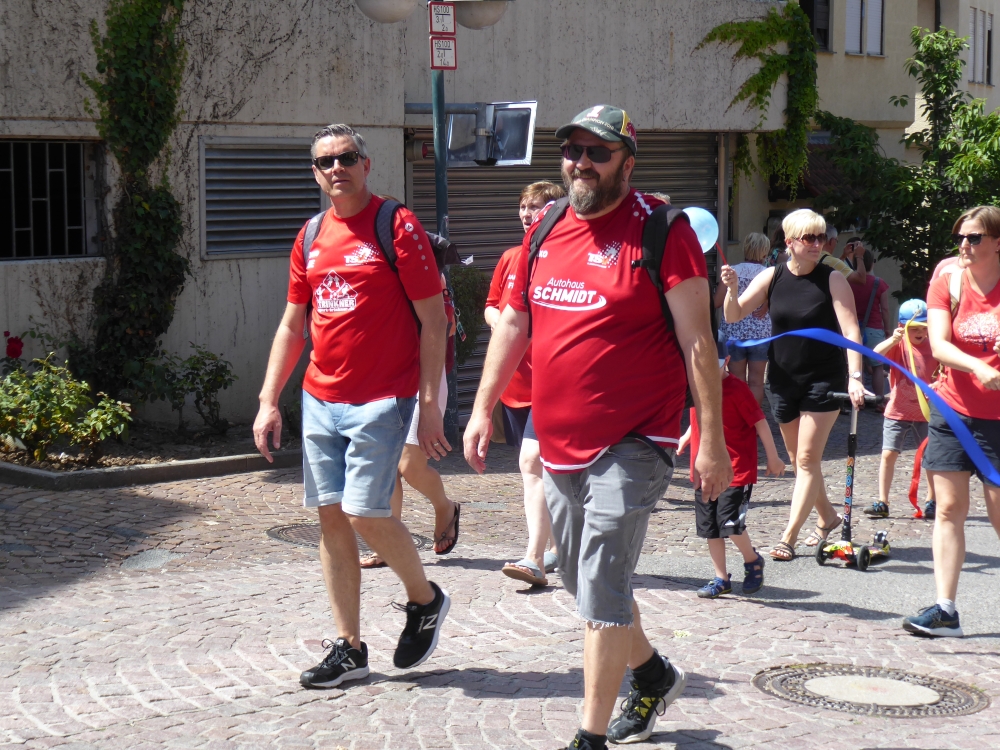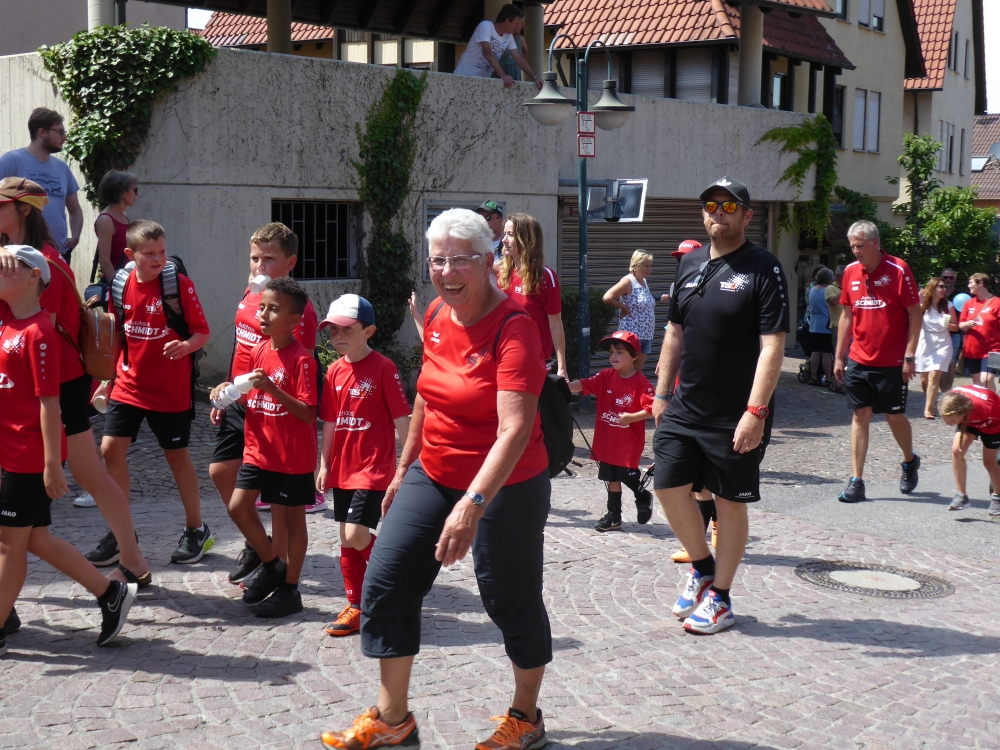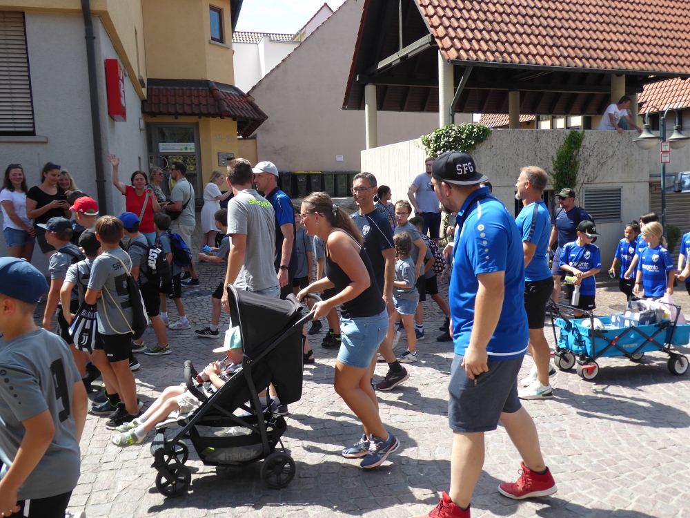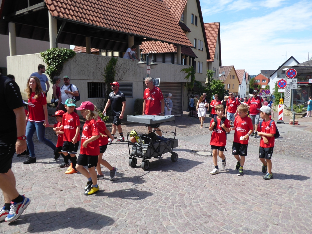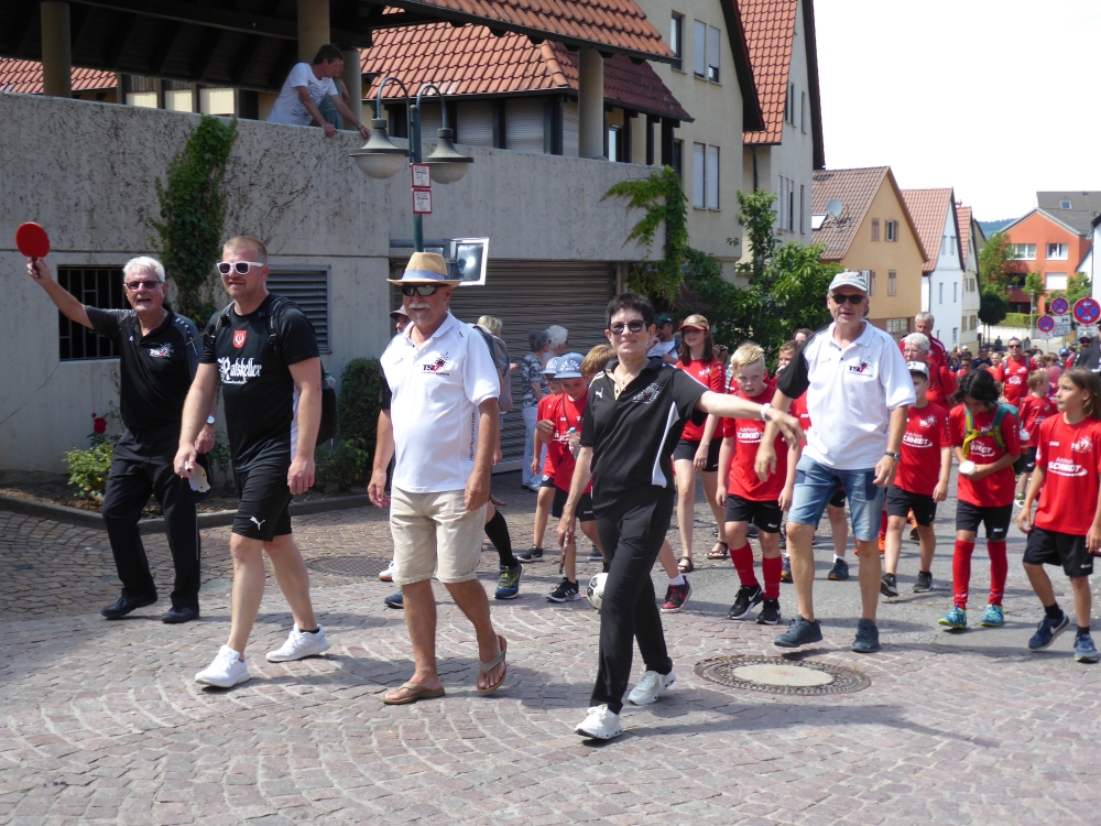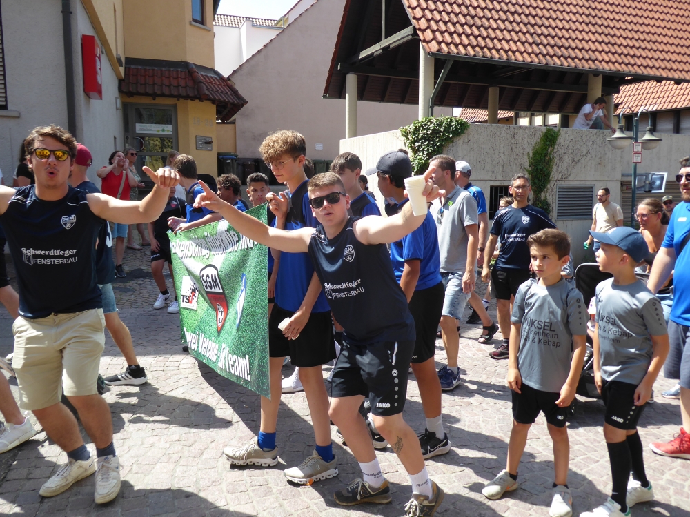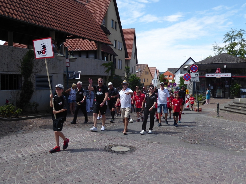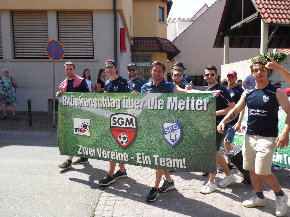 Verein - AllgemeinAm Heimatfest-Sonntag nahmen der TSV und die Fußballer der SGM Sachsenheim mit einer Fußgruppe am Umzug teil. Angeführt von der Vorstandschaft waren Vertreter von allen Abteilungen dabei und präsentierten sich den zahlreichen Besuchern in Trikots und Vereinsshirts. Getreu dem Motto "Der TSV verbindet jung und alt" waren auch fast alle Altersgruppen des Vereins unterwegs und gaben ein gutes Bild ab. Mit einigen aktiven Spielern und einer Auswahl von Jugendteams nahm auch die SGM zwischen dem TSV und den Sportfreunden Großsachsenheim am Umzug des Heimatfestes teil. Mit einem eigens angefertigten Banner demonstrierten die Fußballer die gute Zusammenarbeit der Stammvereine und warben mit Flyern um neue Jugendspieler und Trainer.