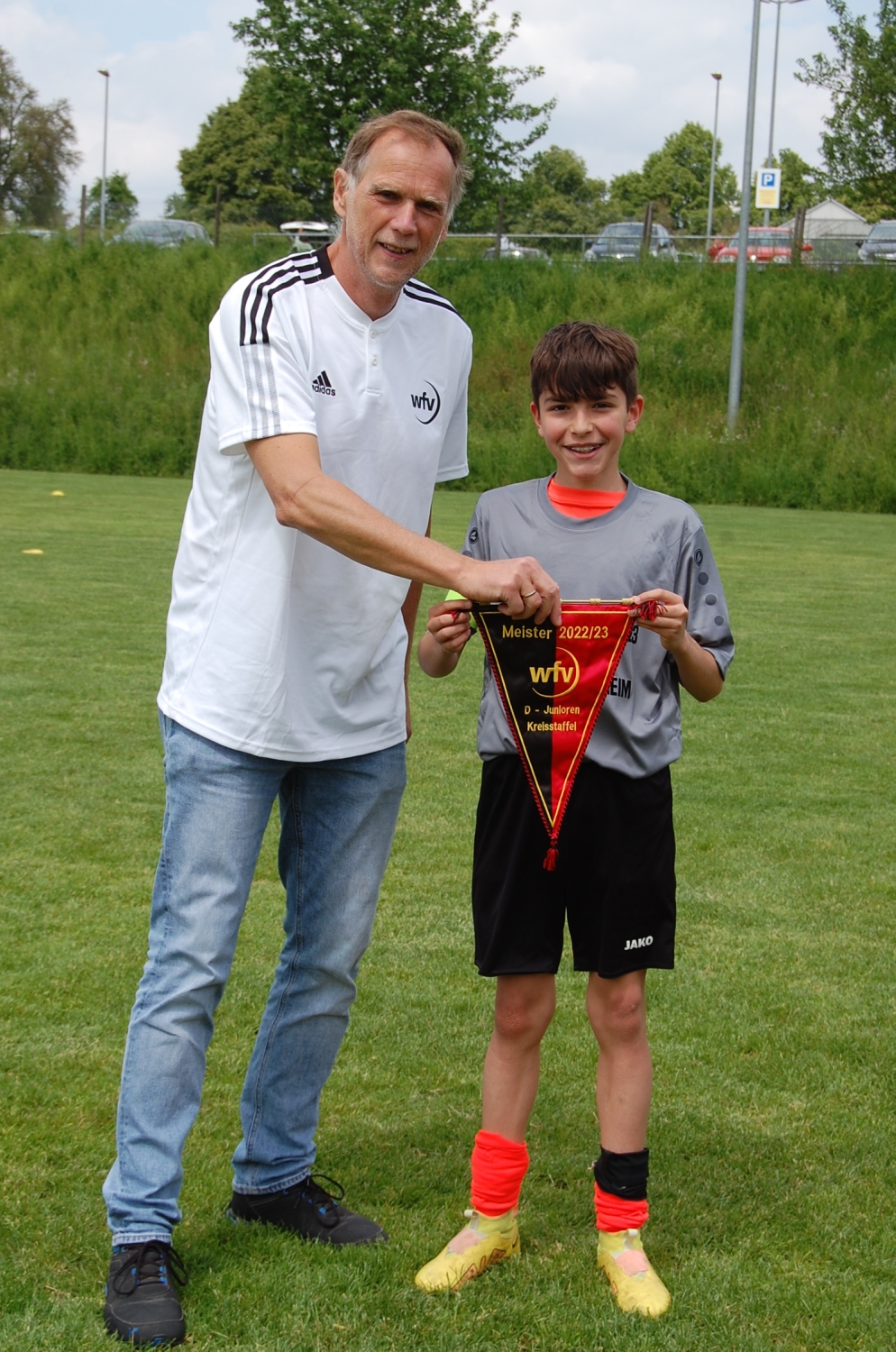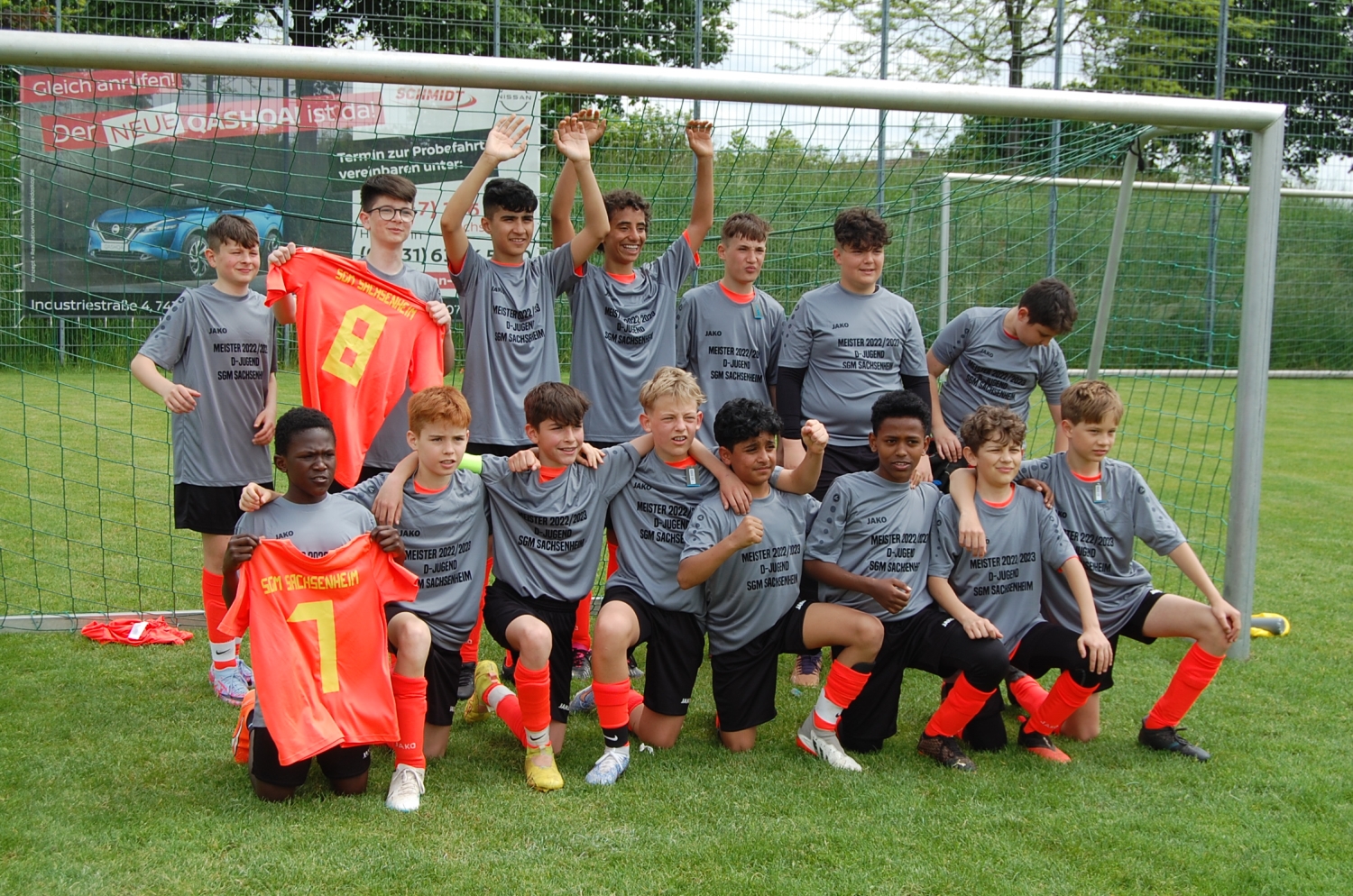 Sechs Spiele, sechs Siege, bei einem Torverhältnis von 24:4. Die Meisterschaft für die D1-Junioren der SGM Sachsenheim in der Kreisstaffel 1 war am Ende eine klare Angelegenheit für das Team der beiden Trainer Markus Pitz und Stefan Rapp, die eine spielstarke Truppe geformt haben. Zum letzten Saisonspiel empfingen die Sachsenheimer die SG Platte 1 (Wiernsheim/Wurmberg) und taten sich gegen die aufopferungsvoll kämpfenden Gäste lange Zeit schwer. Erst mit dem lange fälligen Führungstreffer in der Schlussphase lief es dann für die Sachsenheimer Jungs und die Tore fielen im Minutentakt zum letztlichen 6:0-Sieg und dem damit verbundenen Aufstieg in die Leistungsstaffel. Nach Übergabe der Meistershirts und Geschenken der Spieler an die beiden Trainer bekam Spielführer Dennis Rapp vom eigens angereisten Staffelleiter Wolfgang Kraus den heiß ersehnten Meisterwimpel überreicht. Der Rest war dann Party pur…
