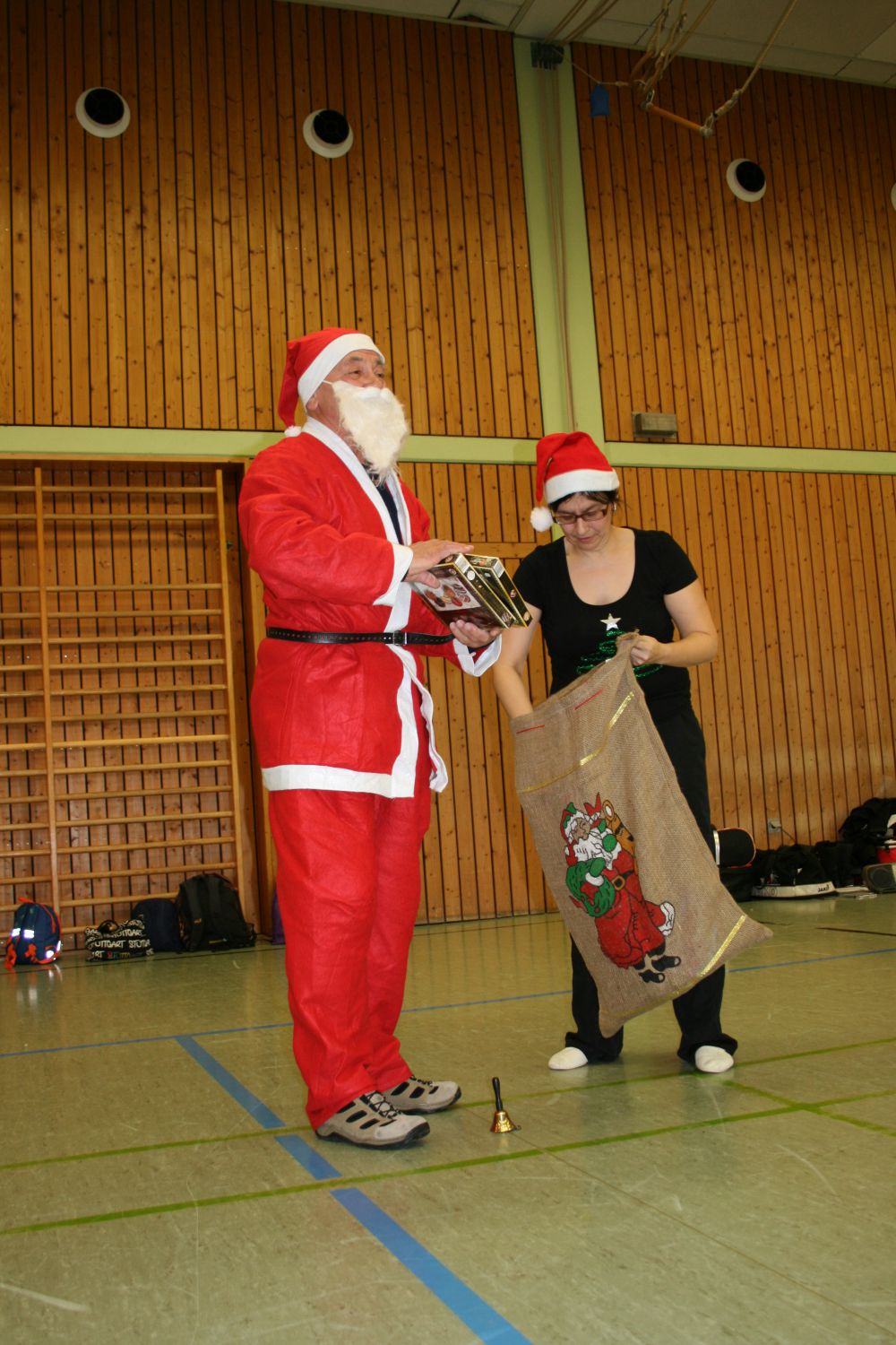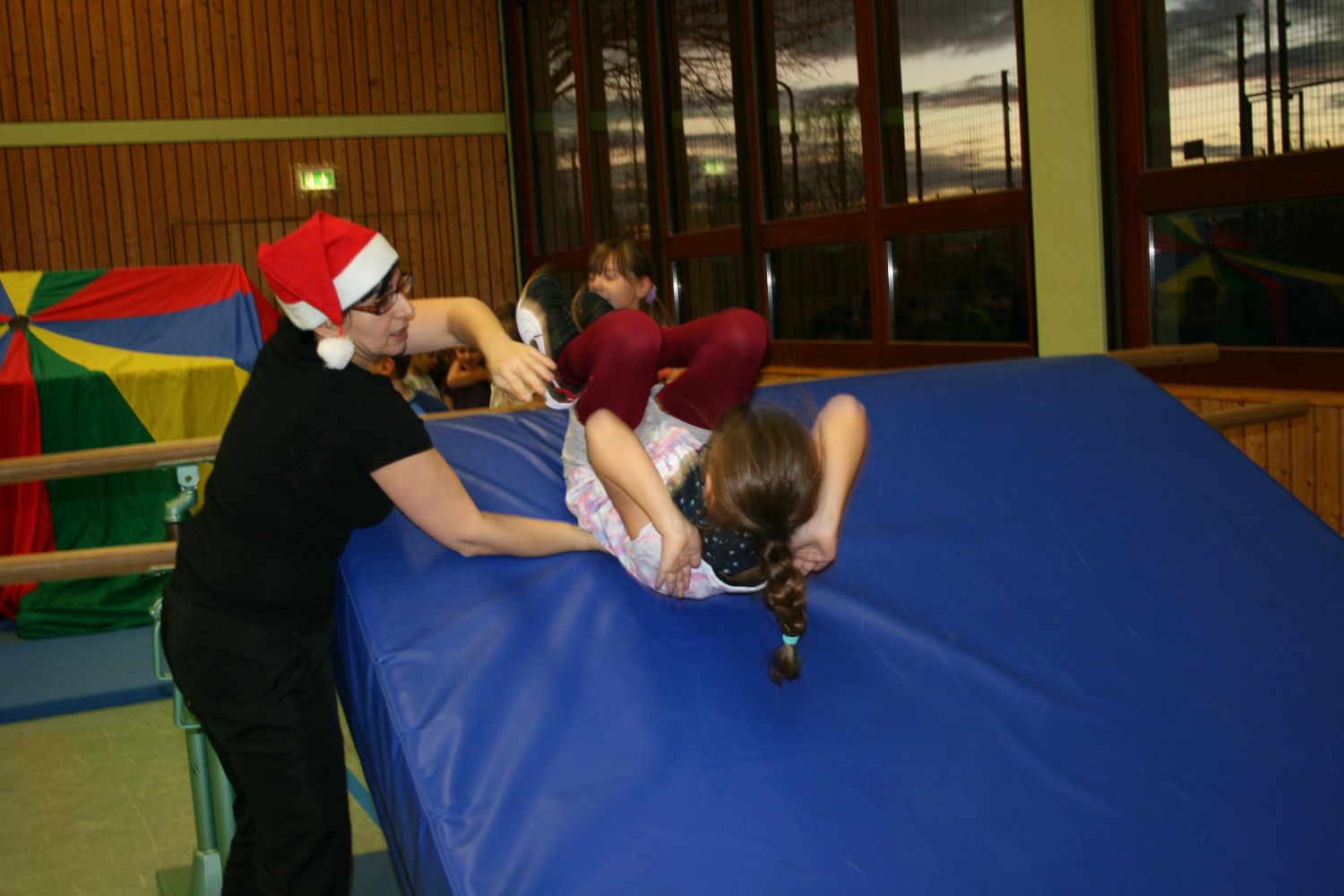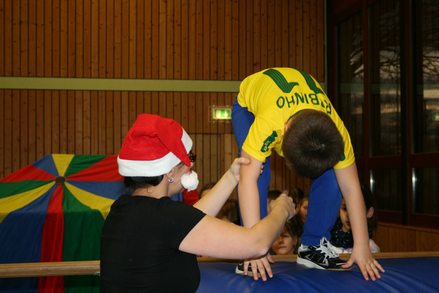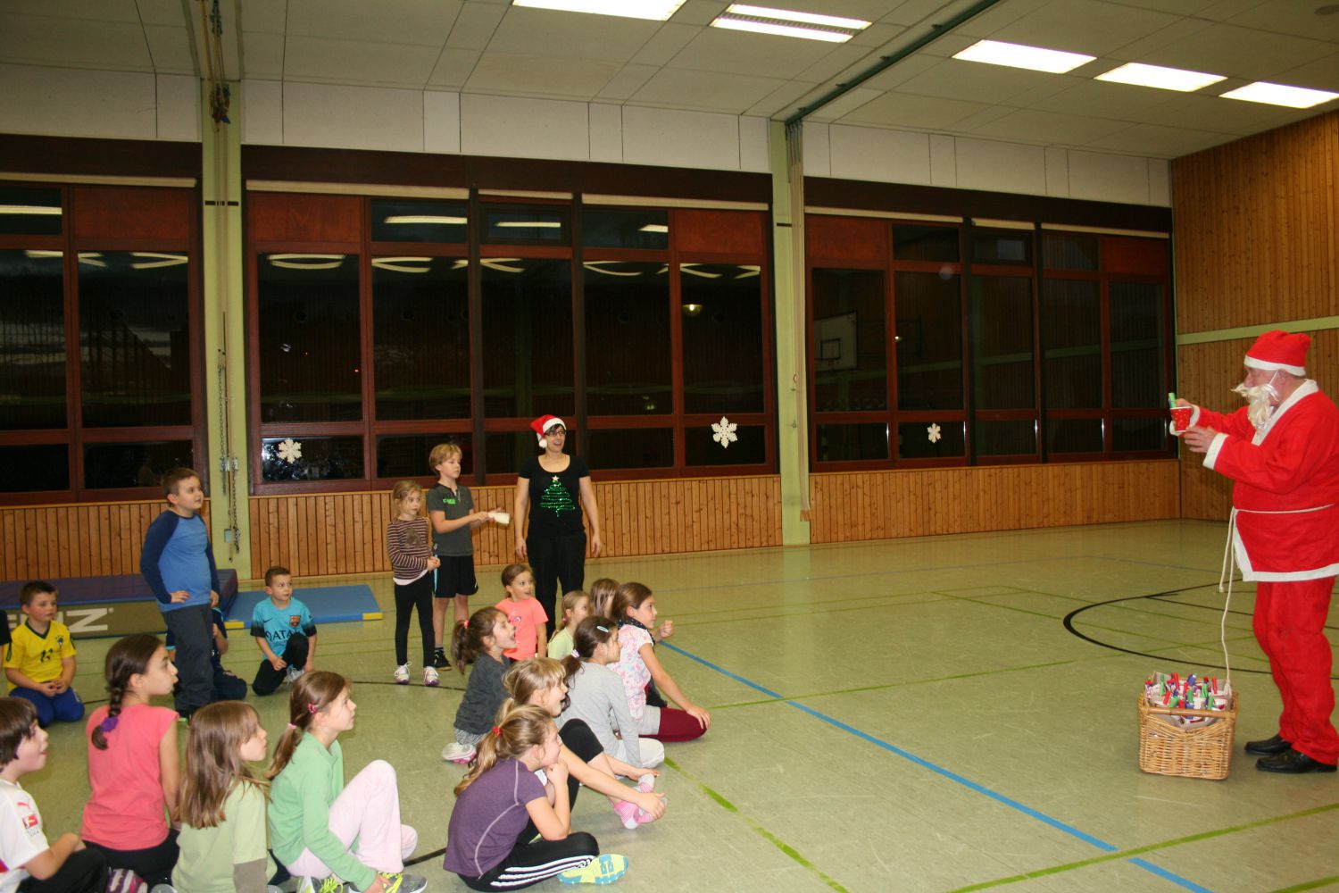 Beide Gruppen erhielten Post vom Weihnachtsmann, der um Ihre Hilfe bei den Weihnachtsvorbereitungen bat. So mussten Sterne gesammelt, Schneeflocken gewirbelt und Rentiere eingefangen werden. Gemeinsam wurde das Kriechen durch den Schornstein und das Rutschen von den vereisten Dächern geübt . Bei so viel Unterstützung durch die Turnkinder ließ sich der Weihnachtsmann nicht lumpen und kam am Ende der Feier jeweils noch persönlich vorbei und überreichte jedem Turnkind eine kleine Überraschung. Als kleines Dankeschön schmetterten die Kinder noch ein lautstarkes Lied von der Weihnachtsbäckerei und wurden von den beiden Trainerinnen in die Weihnachtsferien entlassen.