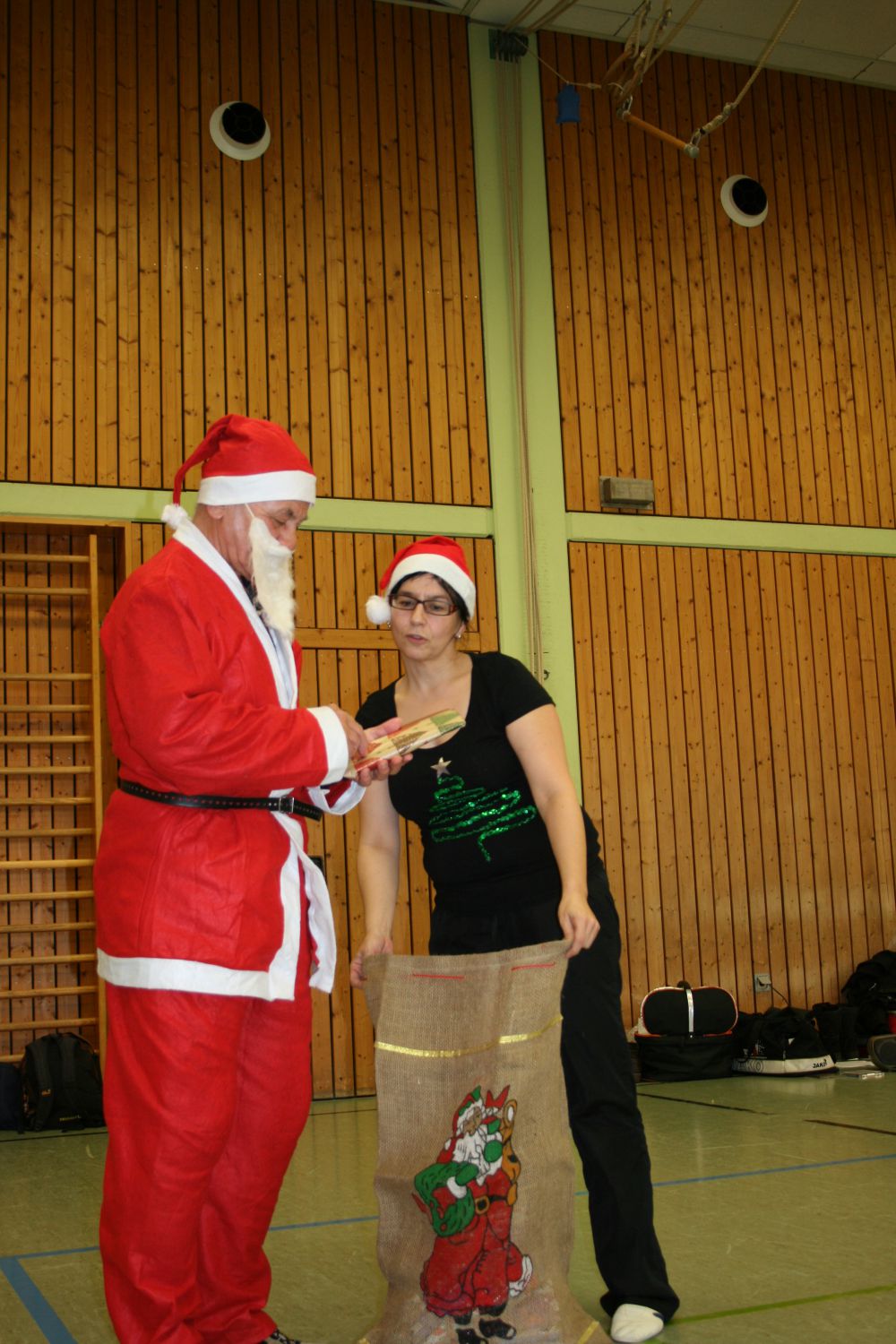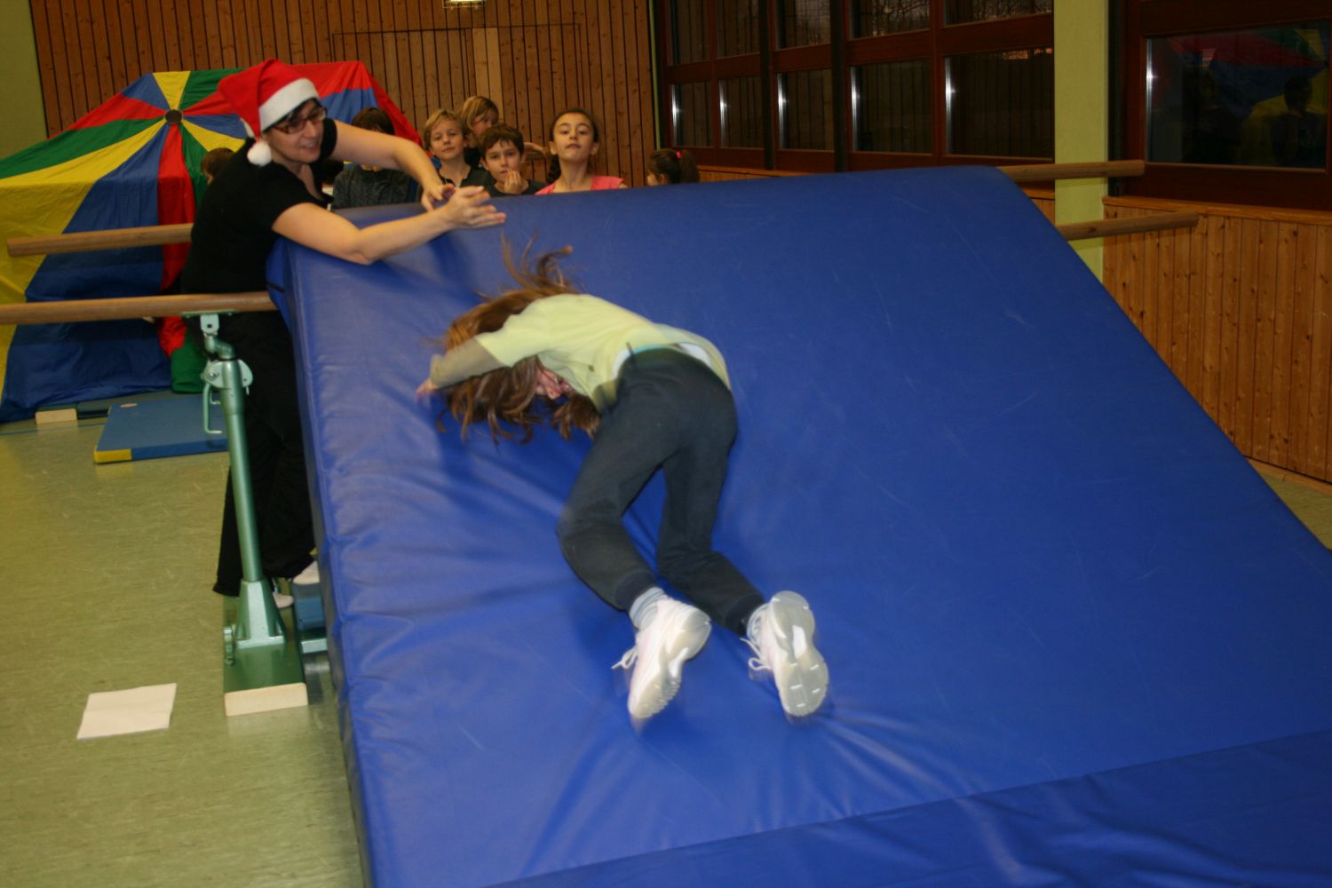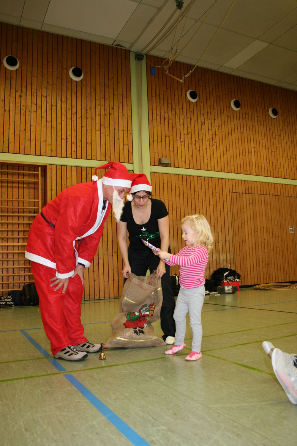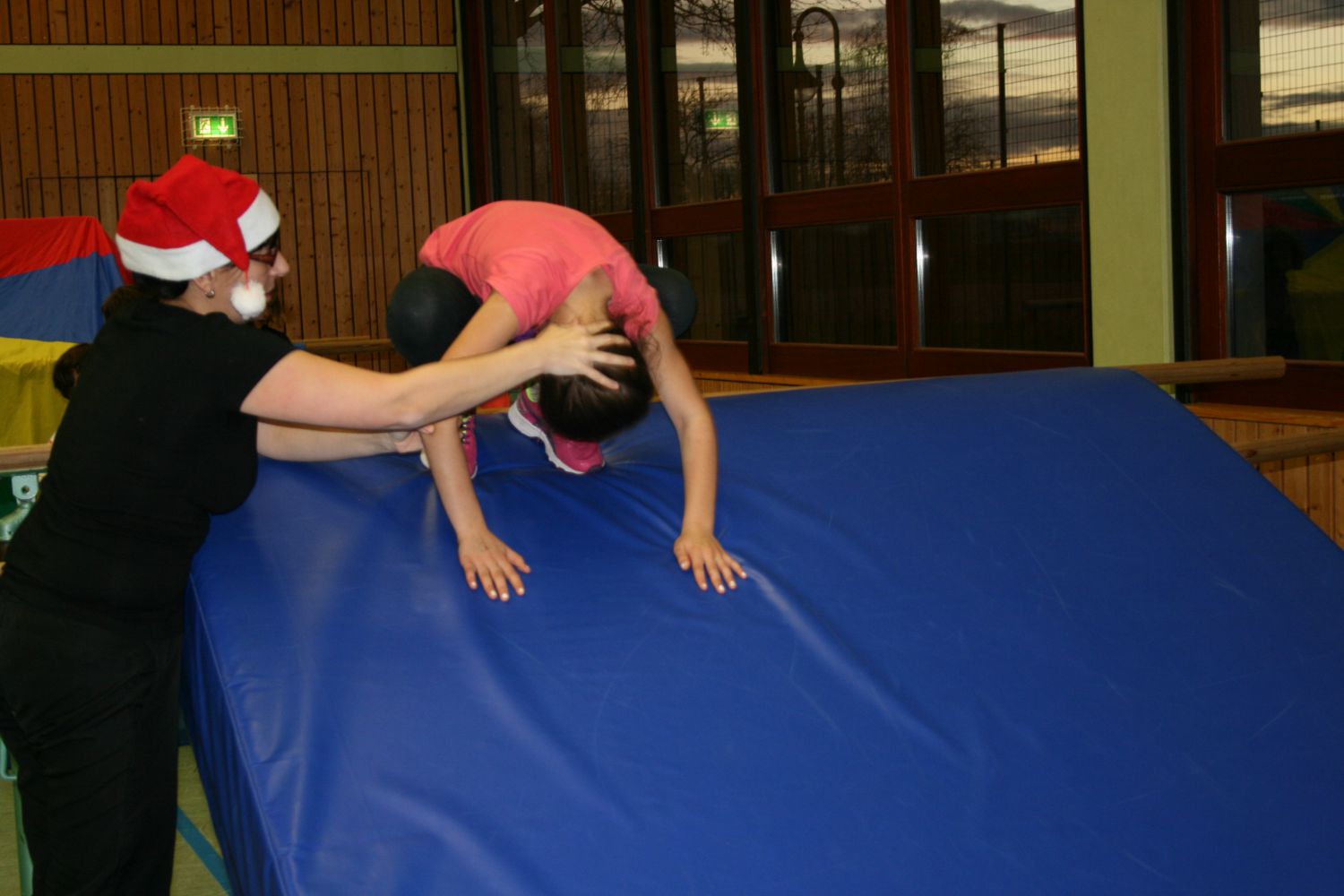 Beide Gruppen erhielten Post vom Weihnachtsmann, der um Ihre Hilfe bei den Weihnachtsvorbereitungen bat. So mussten Sterne gesammelt, Schneeflocken gewirbelt und Rentiere eingefangen werden. Gemeinsam wurde das Kriechen durch den Schornstein und das Rutschen von den vereisten Dächern geübt . Bei so viel Unterstützung durch die Turnkinder ließ sich der Weihnachtsmann nicht lumpen und kam am Ende der Feier jeweils noch persönlich vorbei und überreichte jedem Turnkind eine kleine Überraschung. Als kleines Dankeschön schmetterten die Kinder noch ein lautstarkes Lied von der Weihnachtsbäckerei und wurden von den beiden Trainerinnen in die Weihnachtsferien entlassen.